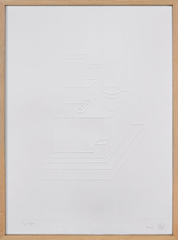 Le design tactile de Nathalie a été méticuleusement transposé en tirages gaufrés en édition limitée, en étroite collaboration avec les artisans graveurs du Thames-Side Print Studio de Londres. Les tirages ont été réalisés en gaufrage à froid sur une presse traditionnelle, avant d'être signés et numérotés à la main par l'artiste. Ce procédé d'impression, alliant précision et texture, a été soigneusement sélectionné pour la profondeur créée. Ce qui paraît simple est complexe et intentionnel. Le procédé construit une image dynamique qui évolue selon l'angle de la lumière, une composition à la fois délicate et minimaliste qui met en valeur son abstraction classique. Pour en savoir plus sur les coulisses de sa création, cliquez ici.