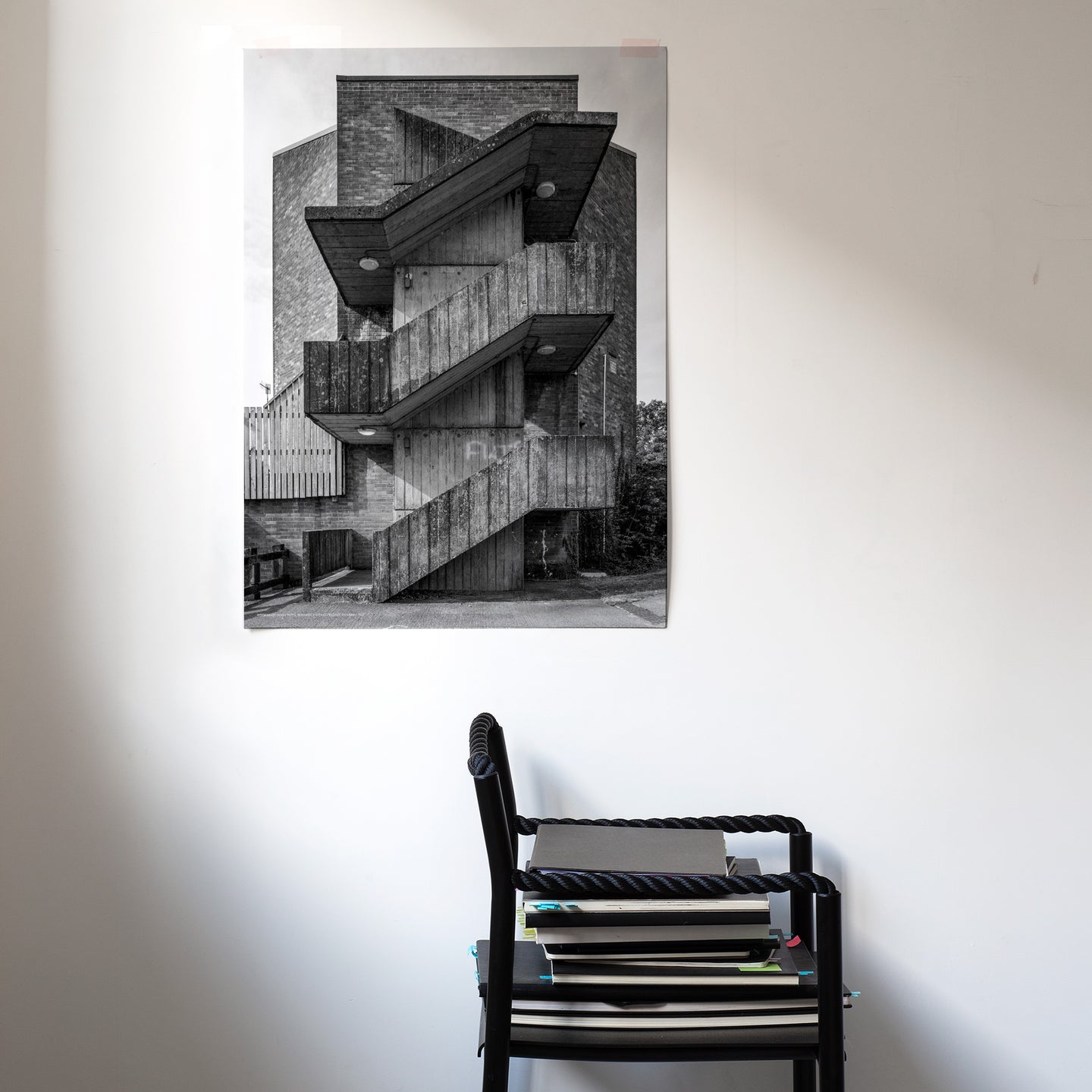From Simon Phipps' new series of five works centred on the staircase as sculptural object. Phipps has spent over 25 years photographing Britain's postwar modernist architecture, finding form, atmosphere and quiet drama in buildings most people pass without seeing. Trained as a sculptor, with a background in film, he brings a particular understanding of light, sequence and material to every image he makes.